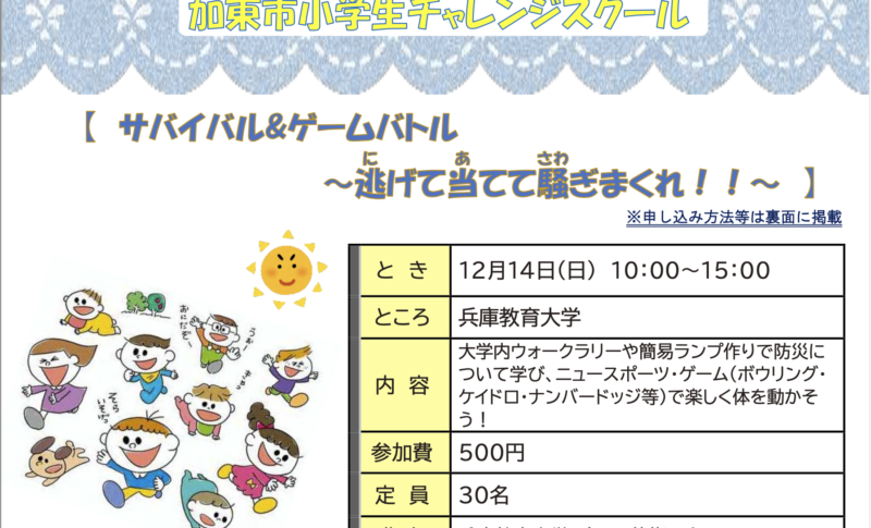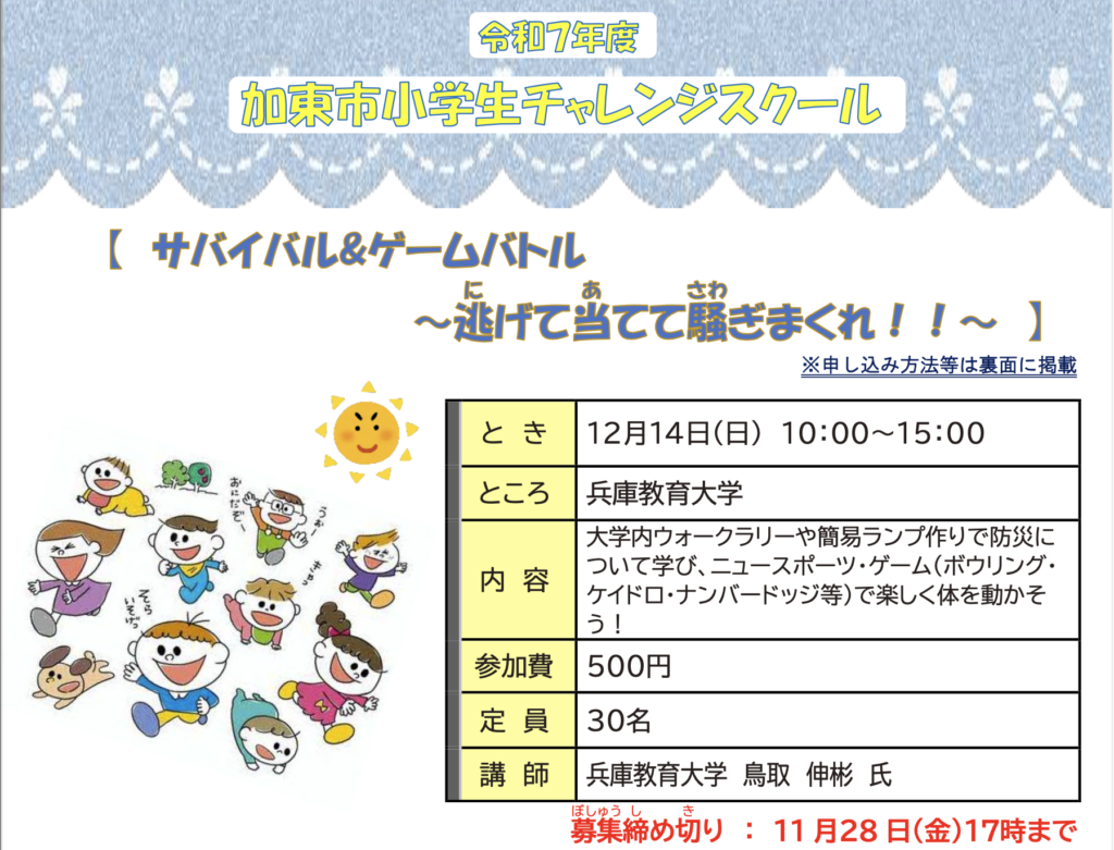 2025年12月14日(日)に加東市小学生スクールの事業「サバイバル&ゲームバトル〜逃げて当てて騒ぎまくれ〜」を研究室にて担当しました。